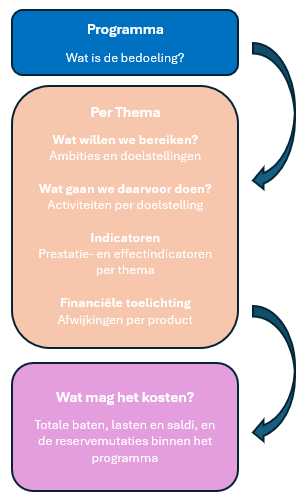 De door ons gebruikte systematiek sluit aan bij de vastgestelde richtlijnen. De W-vragen pellen als het ware af, van het te bereiken doel in 2026 naar welke activiteiten nodig zijn om dit doel te behalen en vervolgens welke middelen nodig zijn voor het bereiken van het doel. Om de begroting niet te omvangrijk te maken focust de begroting zich vooral op nieuwe doelen en activiteiten en op de (inhoudelijke en financiële) veranderingen ten opzichte van de vorige begroting.