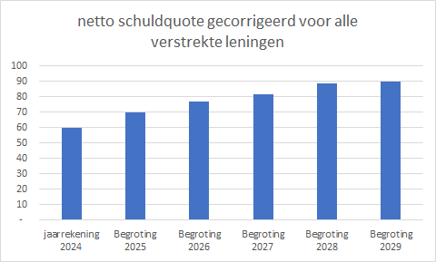 De komende jaren zien we door een toename van de investeringen, die deels worden gefinancierd door leningen, een oplopende schuldquote. Er sprake van een gemiddeld risicoprofiel als deze schuldquote ligt tussen 90% en 130%. Wij hebben voor de komende periode nog een gunstige ratio maar zien wel een stijgende trend, dit wordt vooral veroorzaakt door de komende investeringsopgave die we vanaf 2026 meer gaan financieren met leningen.