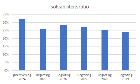 Als signaalwaarde voor de solvabiliteitsratio geldt een percentage van 20%. De ratio daalt in de komende jaren, door de toename aan investeringen gekoppeld aan een afname van de reserves maar blijft nog boven de signaalwaarde.