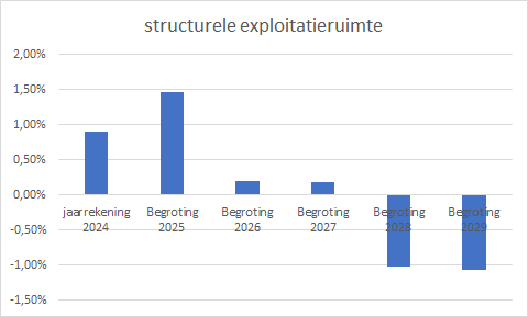 Dit kengetal is van belang om te kunnen beoordelen welke structurele ruimte een gemeente heeft om de eigen lasten te dragen, of welke structurele stijging van de baten of structurele daling van de lasten daarvoor nodig is. Dit kengetal geeft aan hoe groot de structurele exploitatieruimte is, doordat wordt gekeken naar de verhouding tussen structurele baten en structurele lasten in vergelijking met de totale baten. Bij een positief getal zijn de structurele baten hoger dan de structurele lasten, verder geldt, hoe hoger dit kengetal is, des te beter. De jaren 2026 en 2027 laten nog een structureel overschot zien, de jaren daarna juist een tekort.